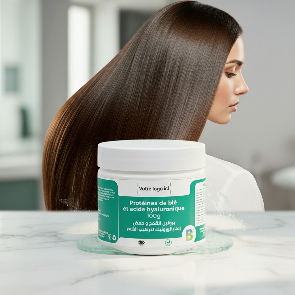 “منتج بروتين القمح وحمض الهيالورونيك لترطيب الشعر، تغذيته، تقويته، ومنحه لمعانًا صحيًا وحريريًا.”
