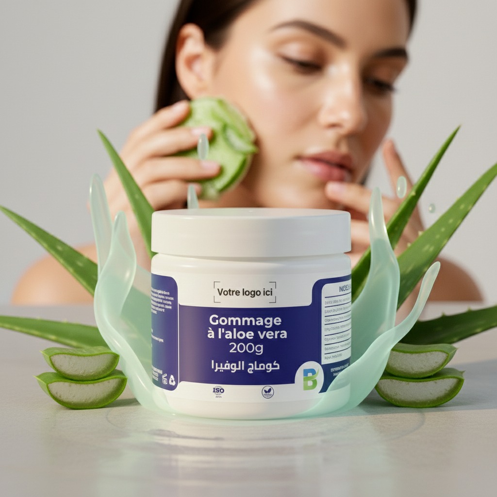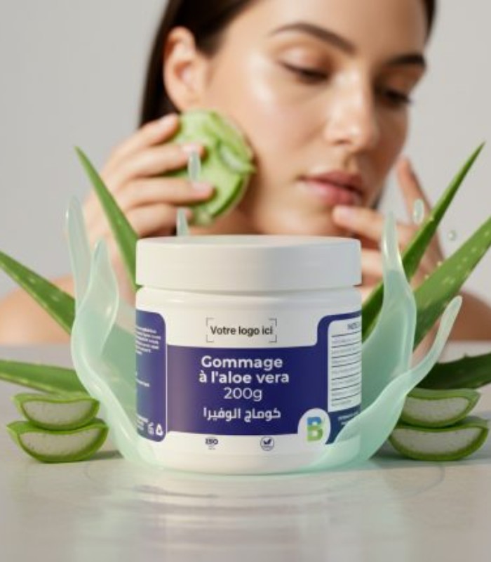 “مقشّر لطيف بالألوفيرا ينعم البشرة، يرطّبها، ويمنحها نعومة وانتعاشًا طبيعيًا.”